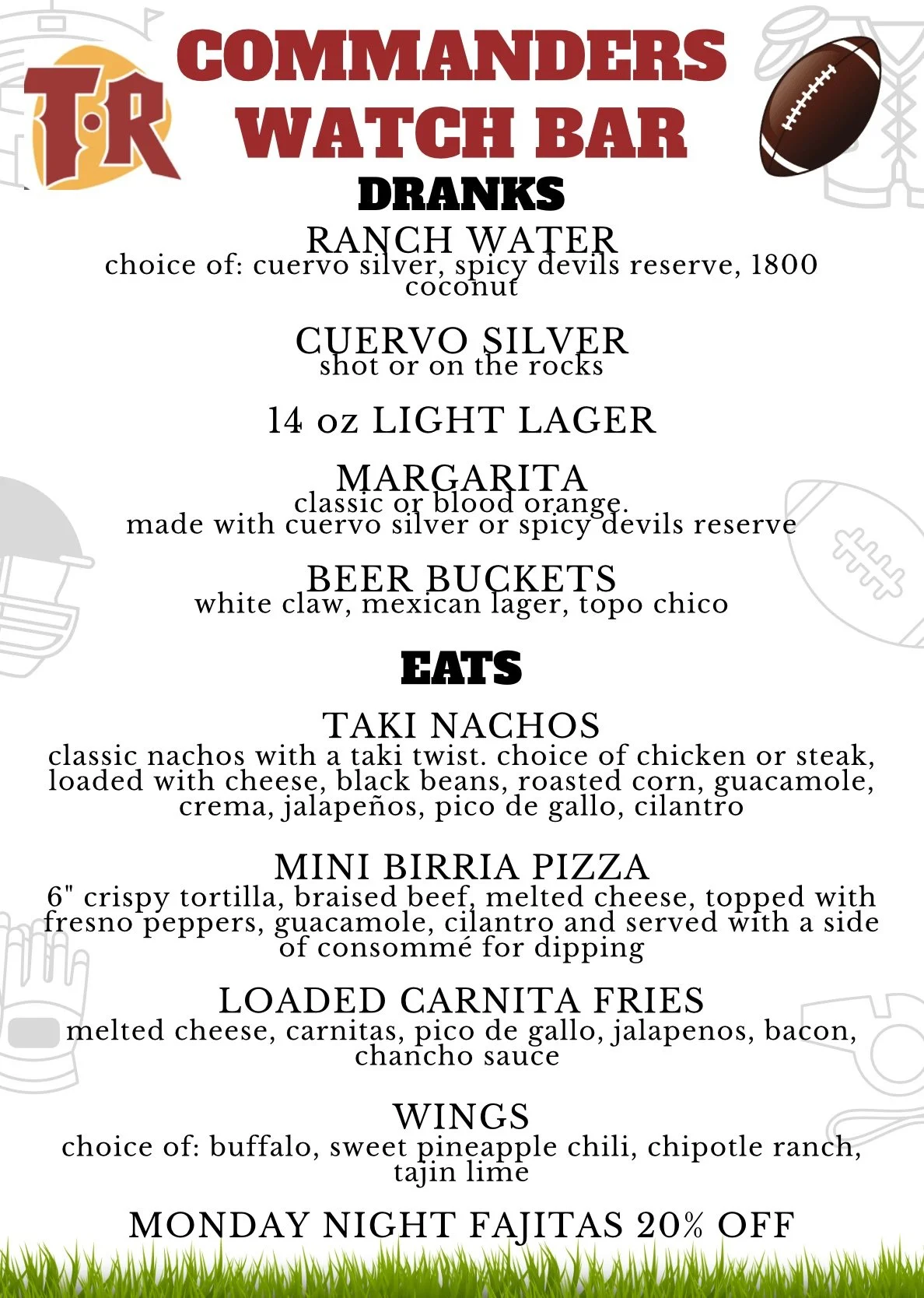 Grab your crew and come catch every play with us—don’t bother searching “Where can I watch the Commanders game?” or “Commanders Game today.” The answer is always Taco Rock.