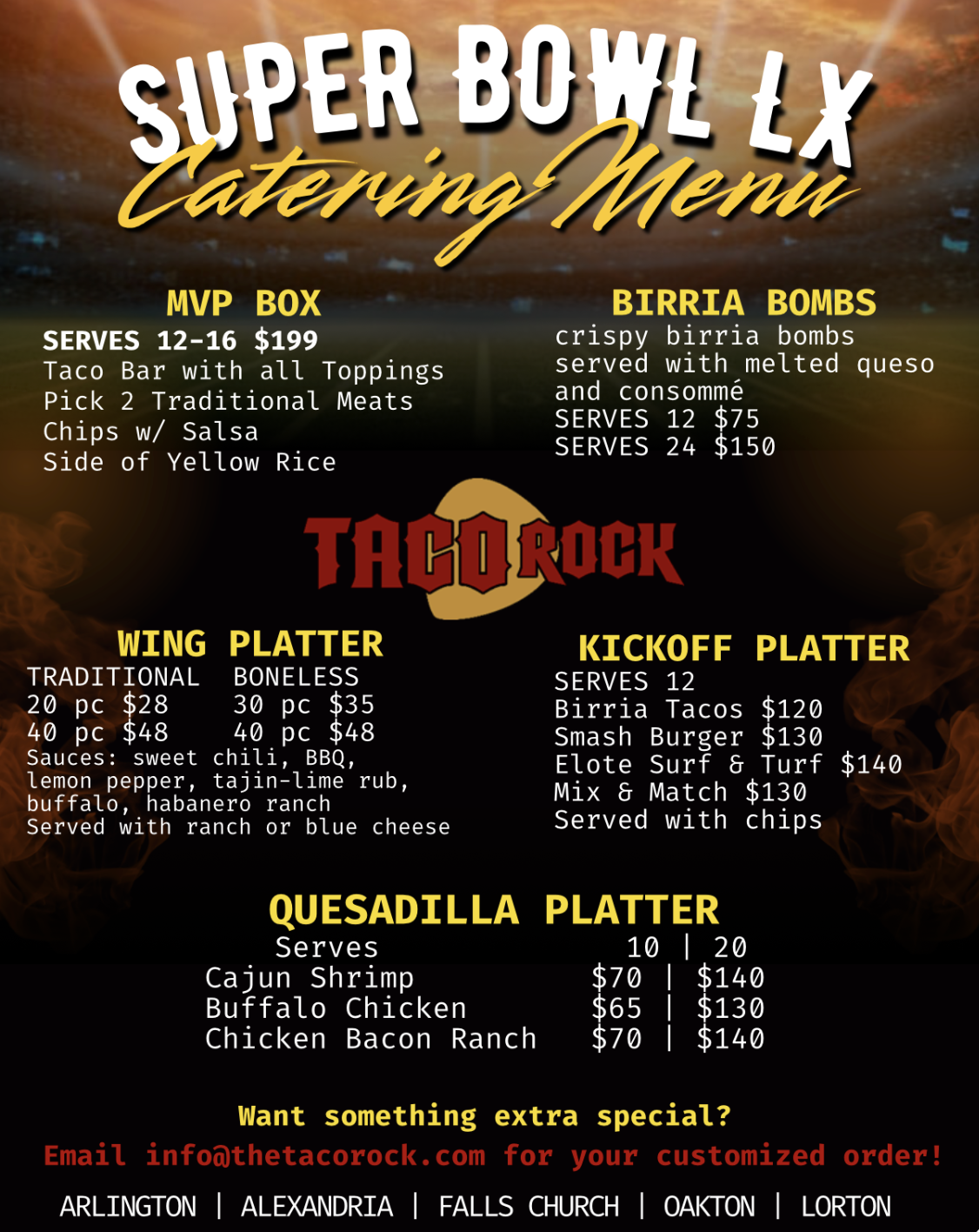 Watch the Big Game with us or bring Taco Rock to your watch party. Big screens, bold flavors, ice-cold drinks, and catering that feeds the whole crew—no stress required.